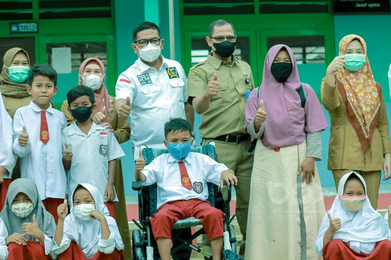 LEBAK,- Ketua DPRD Provinsi Banten Andra Soni memberikan bantuan kursi roda kepada M. Ajrib, siswa SDN 1 Cikarang, Kecamatan Muncang, Kabupaten Lebak, Provinsi Banten, pada Senin (18/10/21).